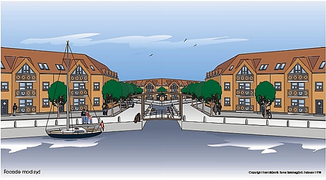 Denne facadetegning var det første oplæg til en evt. udformning af det nye havnemiljø.
